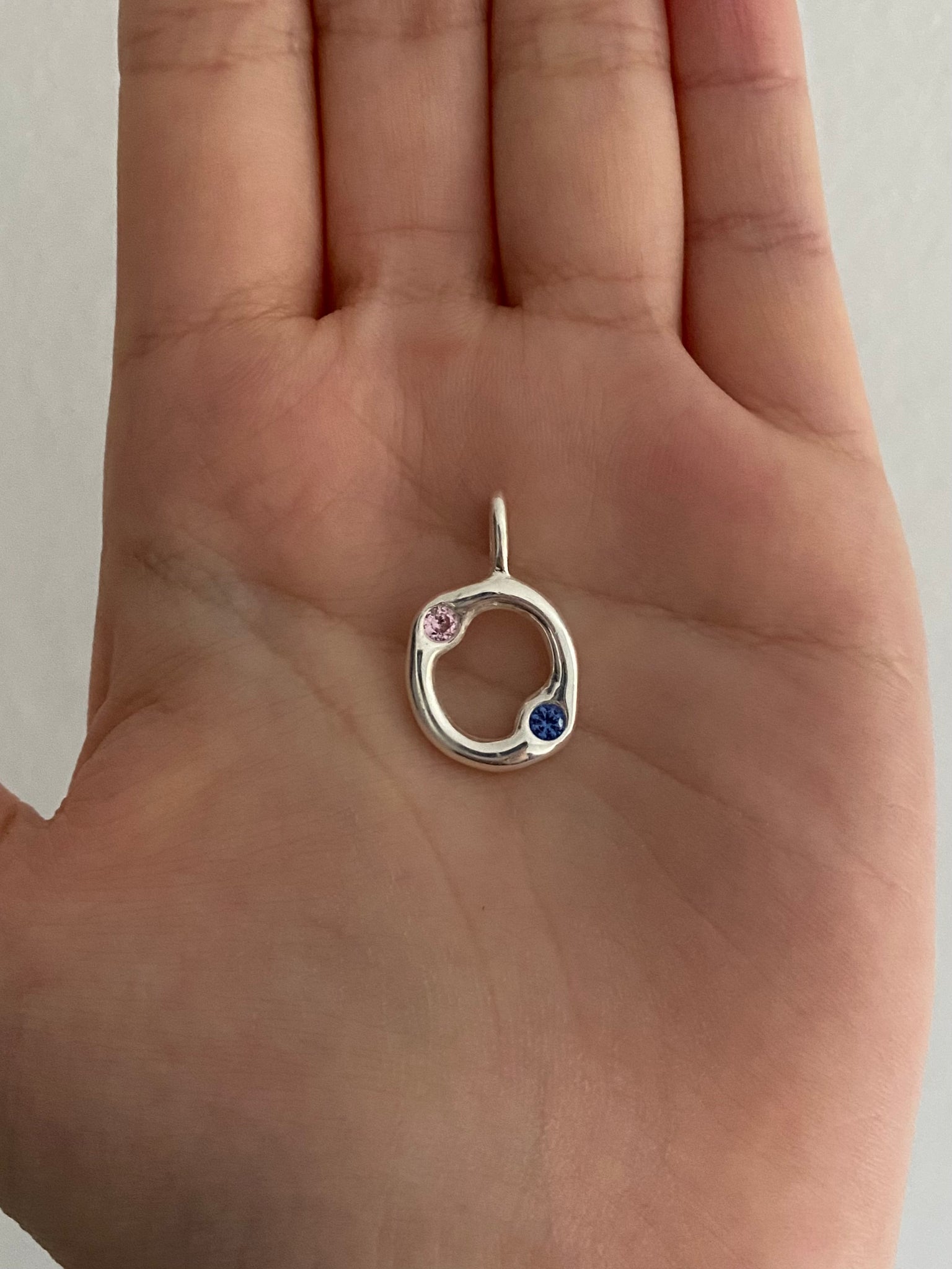 Return of the pink&blue bejewelled donut necklace! Set with a lab grown tanzanite and bany pink cubic zirconia