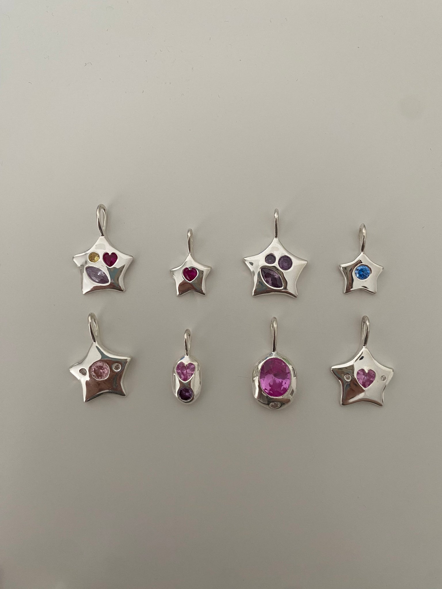 my classic bejewelled star charm set with a sherbet lemon round gemstone, lilac marquise, and a lab grown ruby heart gemstone
