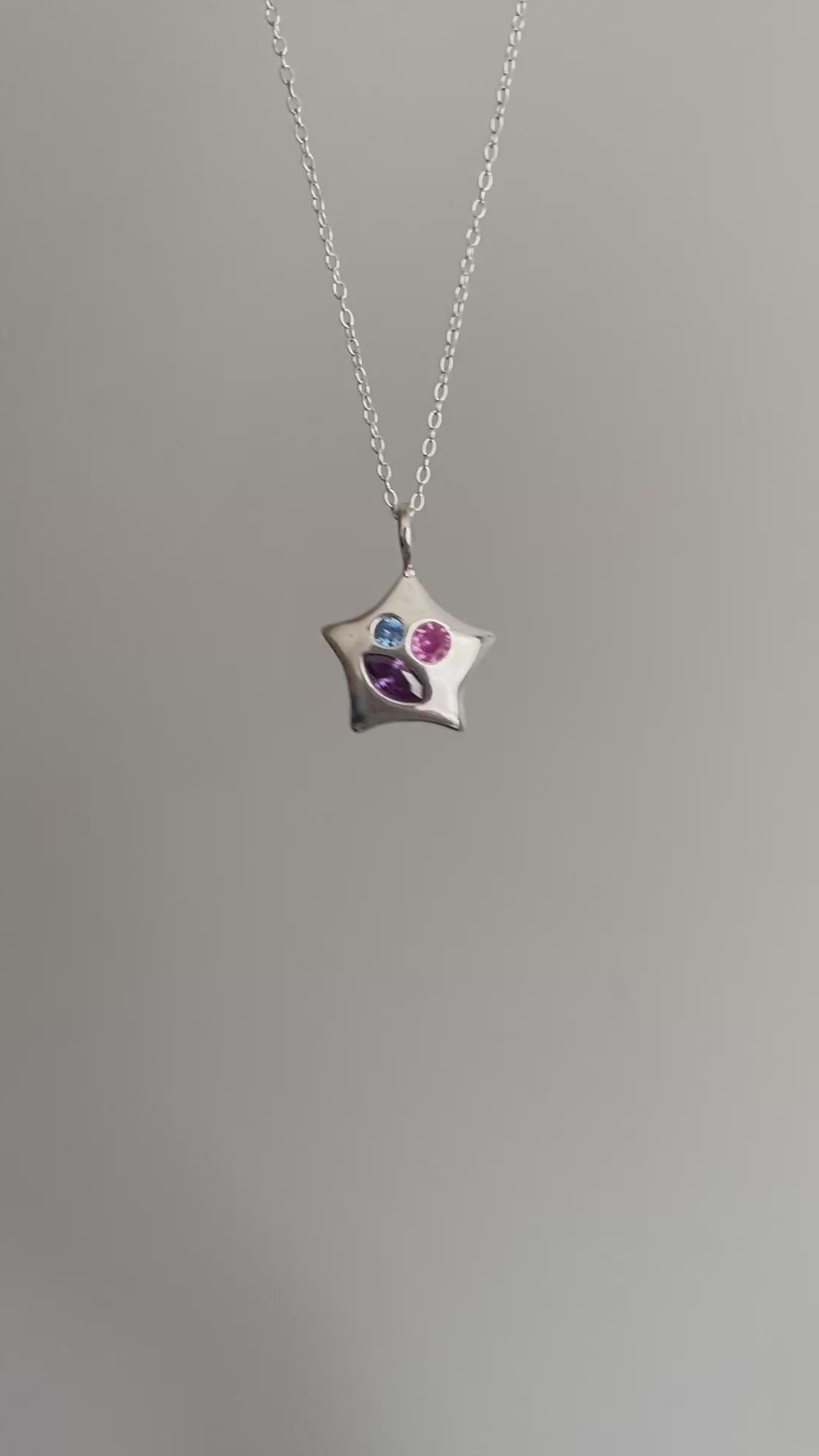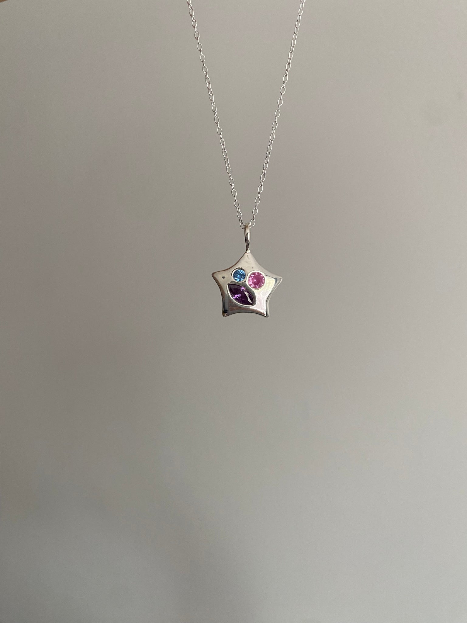my classic bejewelled star pendant set with a lab grown pink sapphire, lab grown amethyst, and lab grown blue sparkler