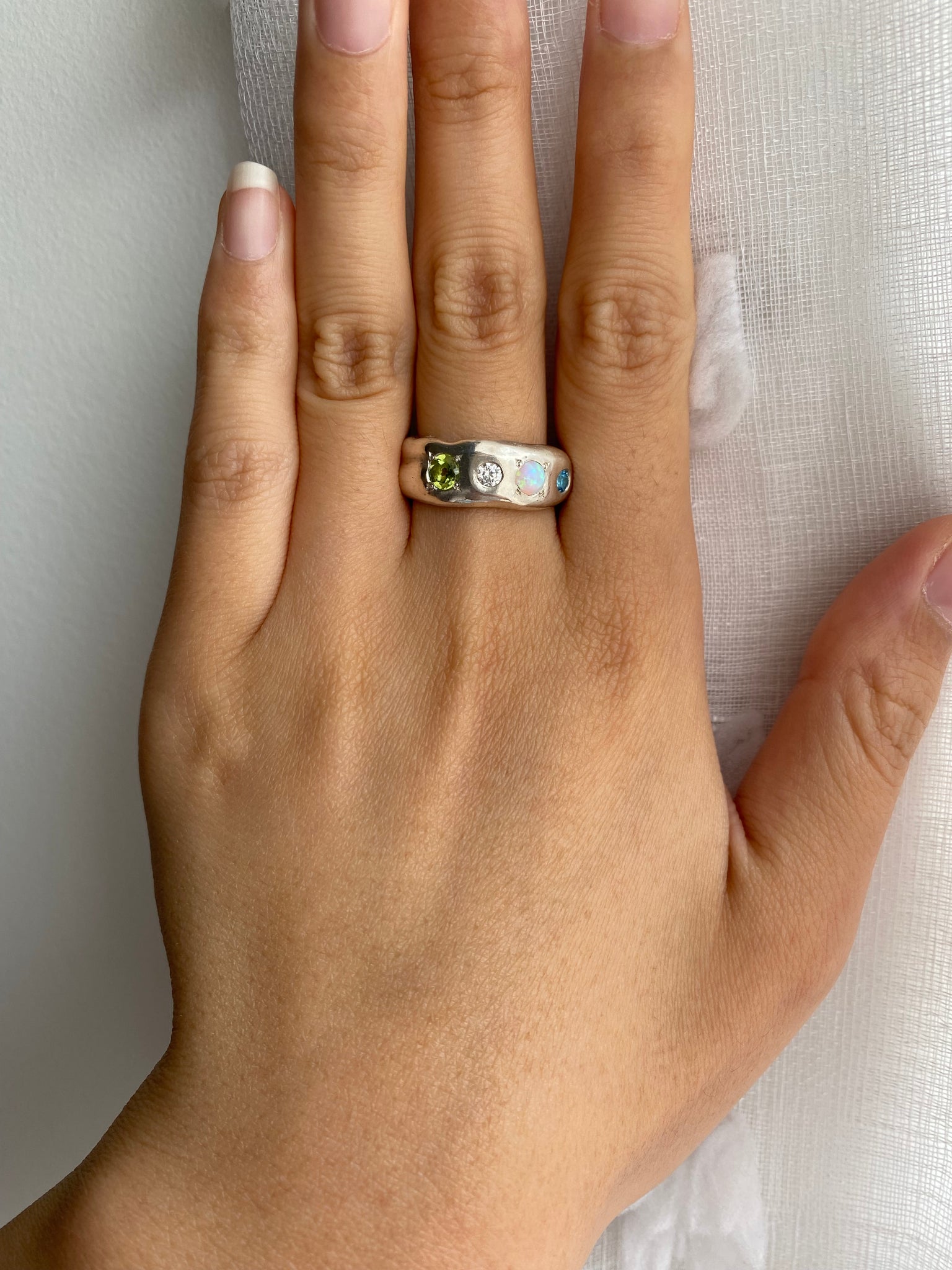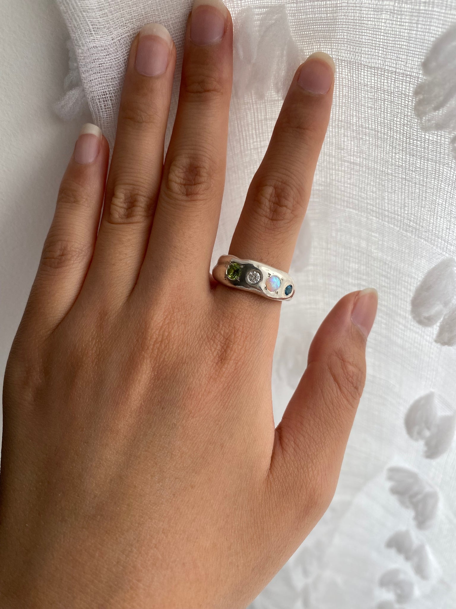 stones are peridot, blue topaz, white cz, and a lab grown opal 🫶🏼