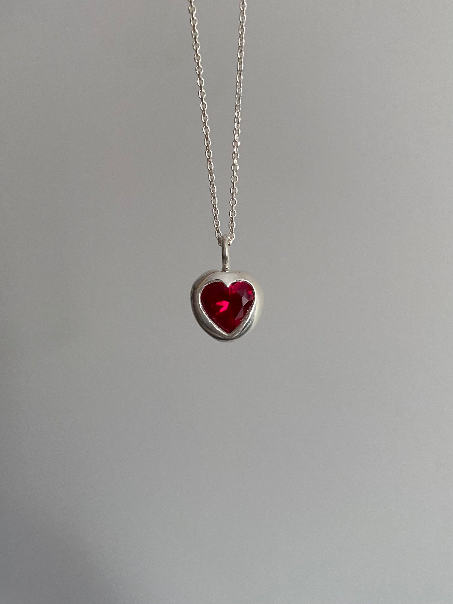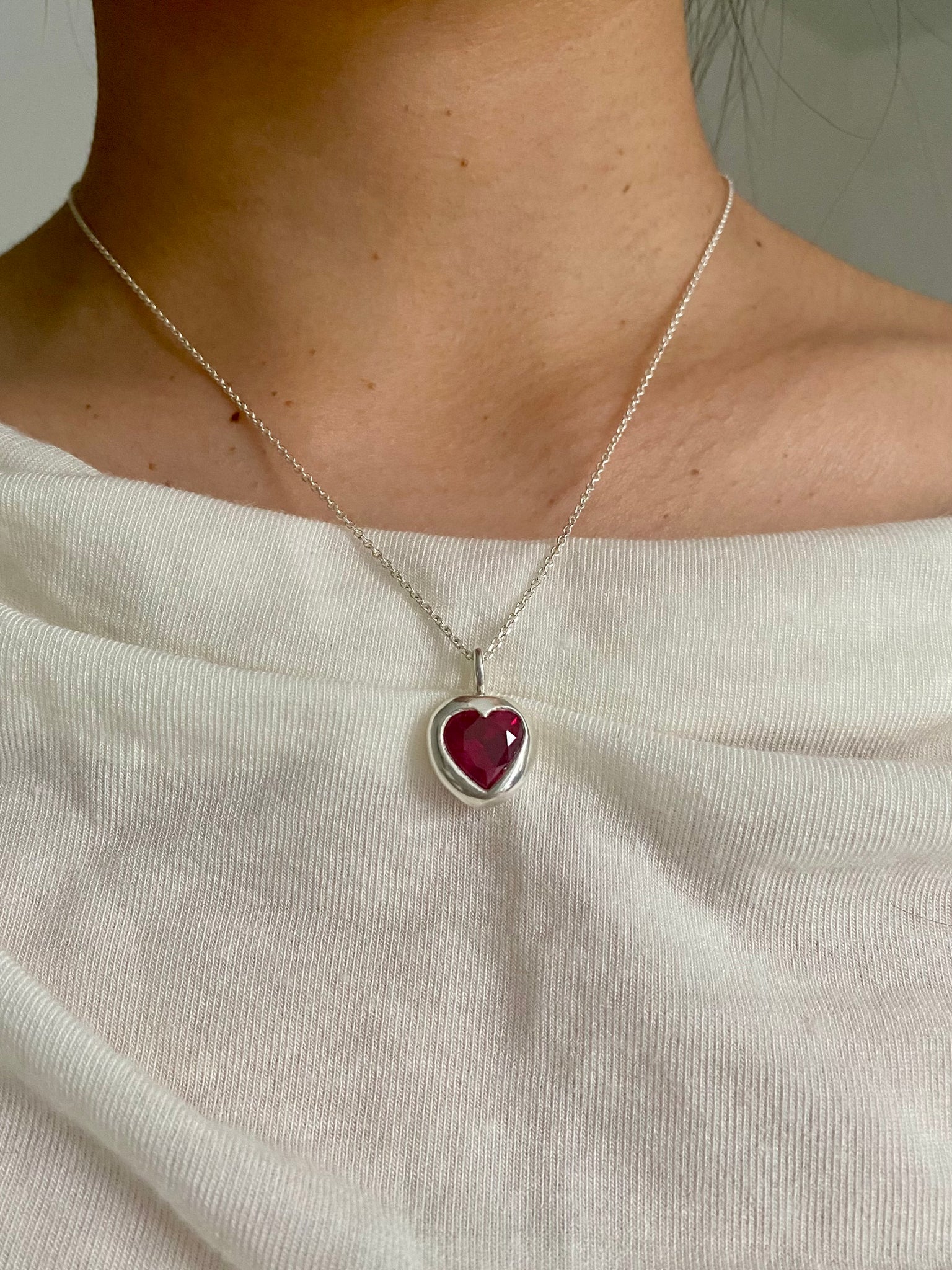 handmade with love, chunky silver heart pendant set with a lab grown ruby heart gemstone