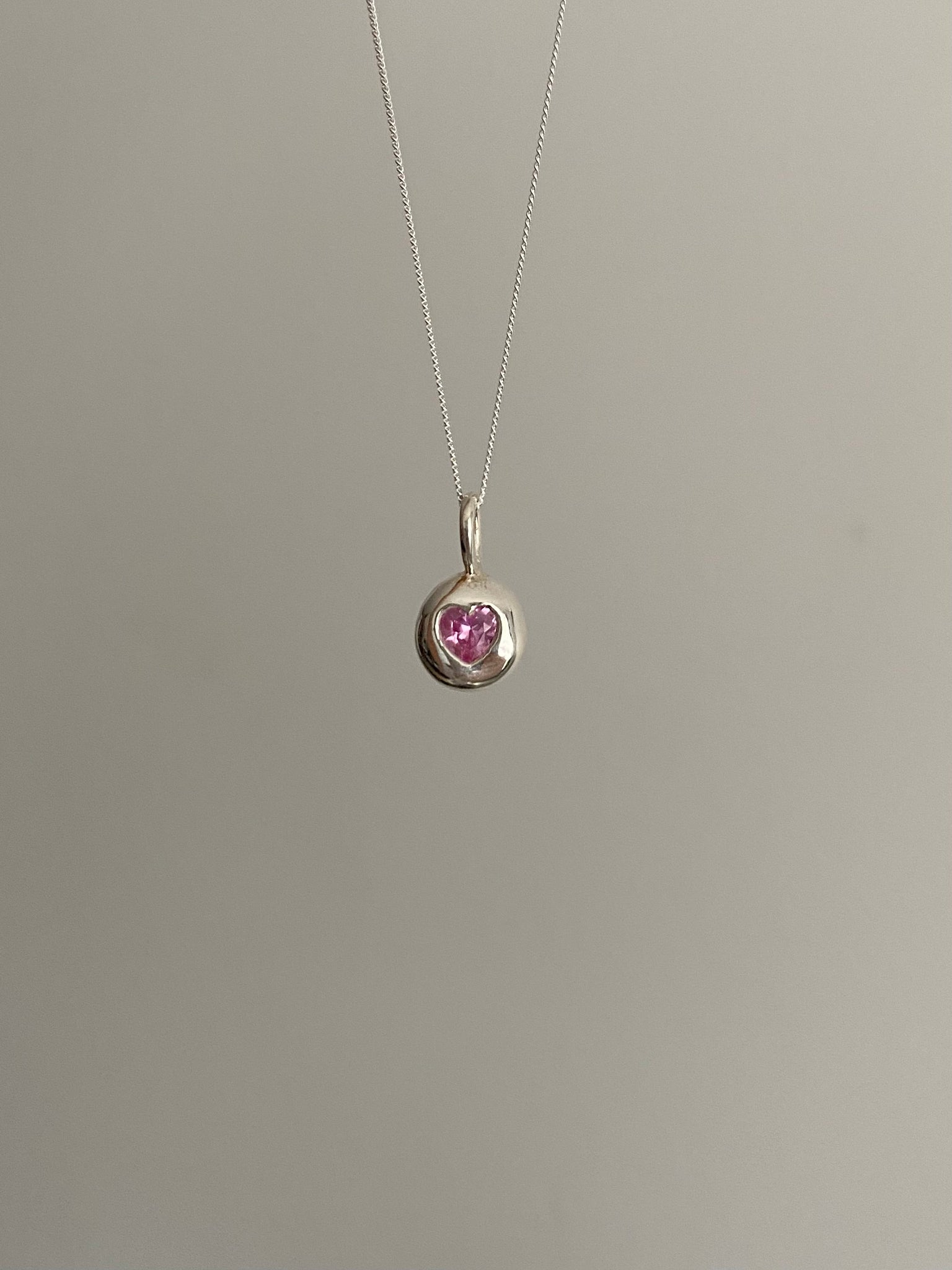 chunky sterling silver bubble pendant set with a lab grown pink sapphire heart gemstone