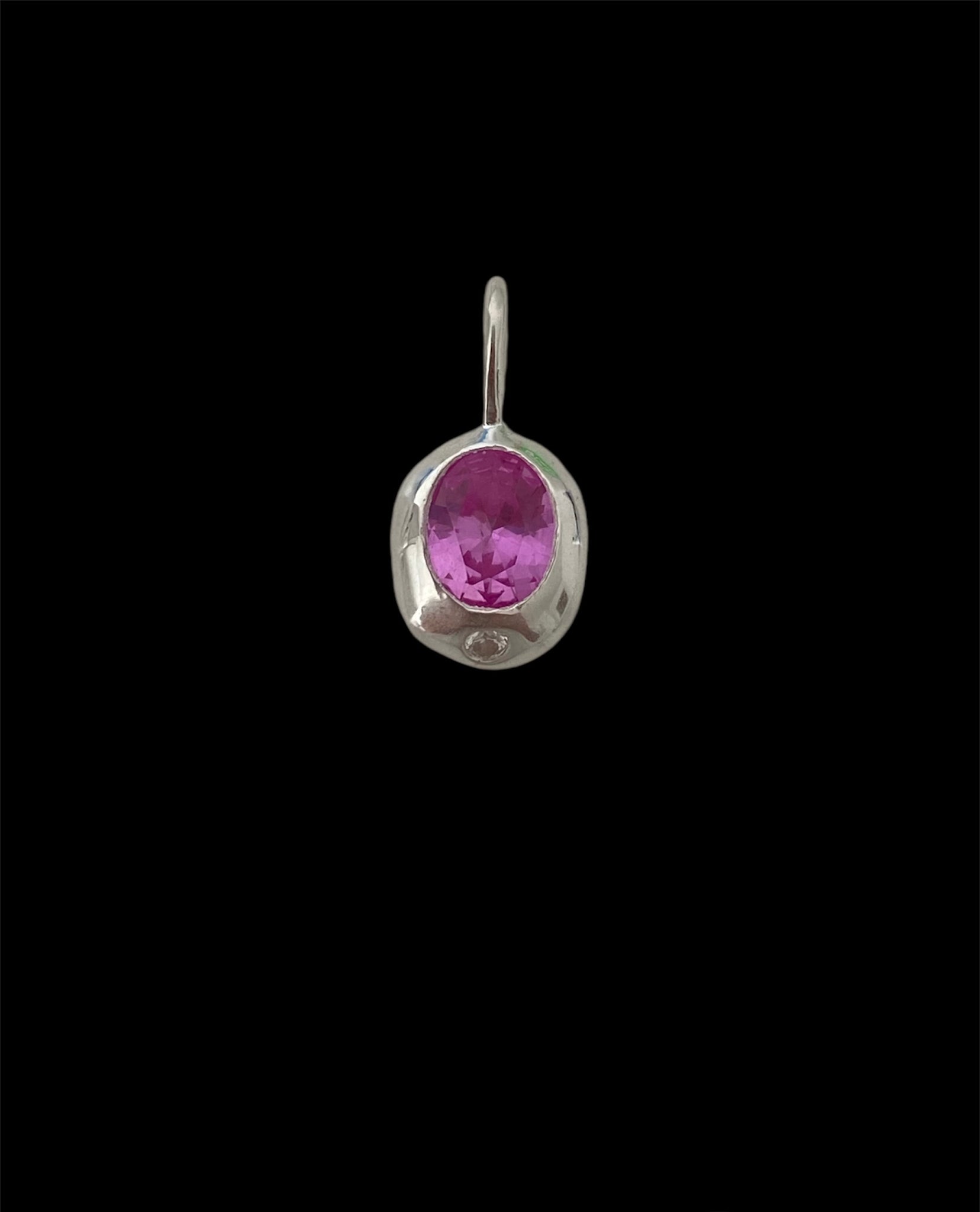 handmade chunky tab pendant set with a gorgeous Barbie pink lab-grown sapphire stone and a tiny round white lab-grown gemstone