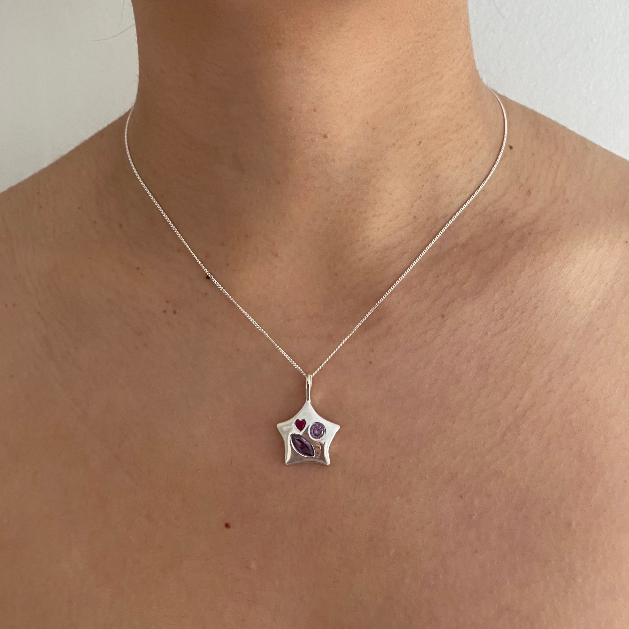 Chunky star necklace set with heart lab grown ruby gemstone, and two purple lab grown gemstones